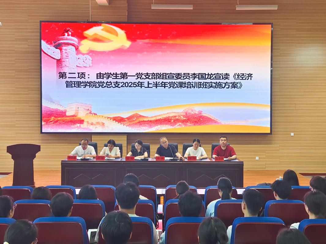 李国龙宣读《经济管理学院党总支2025年上半年党课培训班实施方案》,详细介绍了此次培训班的培训目的、方式、内容和组织要求。培训采取自学和集中辅导、课堂面授和观看电视录像、讨论和撰写党课心得相结合的方式进行,所有学员需按照教学要求配合完成各个培训环节,成绩合格者方可获得结业证书。