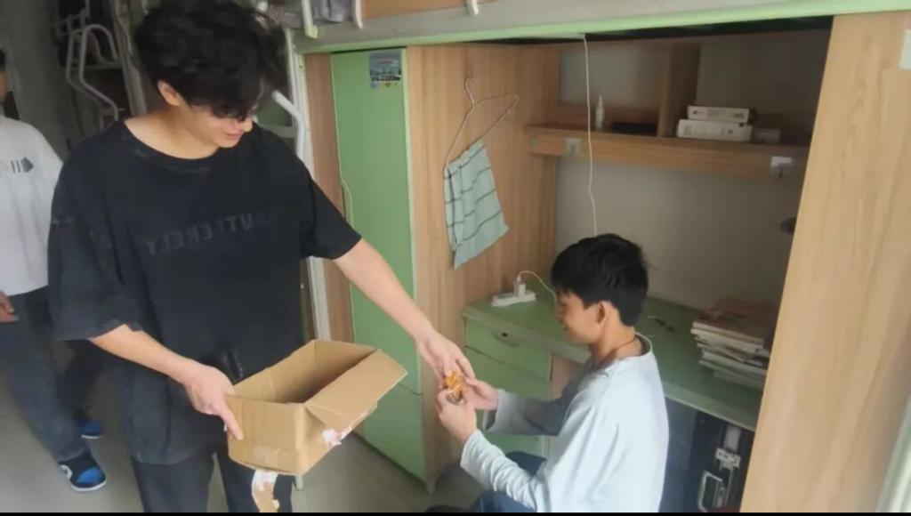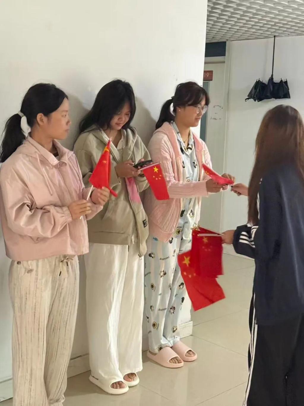 活动期间,朋辈学长学姐手持中秋月饼与小国旗,逐一走进留校同学的宿舍。每到一处,他们先将月饼、小国旗作为纪念礼物分发给同学们,随后便与大家亲切交流,细致询问假期安排与日常生活动态,尤其对新生格外关注,耐心指导新生熟悉校园生活,叮嘱大家合理规划假期时间,做好学习与休息的平衡。