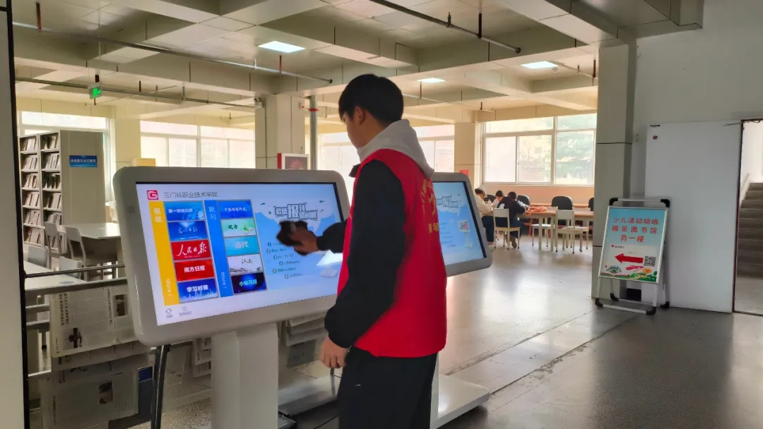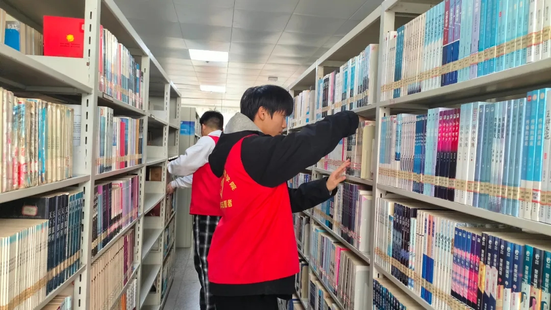 活动现场,志愿者们身着统一红马甲,精神饱满、热情高涨。大家明确分工、默契协作,有条不紊地开展各项服务工作:有的按照图书分类编号细致整理错乱书架,将散落书籍逐一归位、规范摆放,确保书目整齐有序、方便师生查阅;有的手持清洁工具,认真擦拭书架、桌面、窗台及公共阅览设施,仔细清理角落灰尘与杂物;还有的主动引导往来读者文明借阅,轻声提醒保持安静,协助维护阅览秩序。