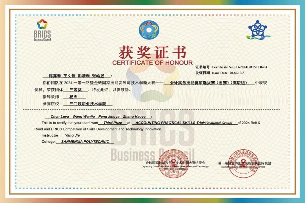 2024年“一带一路”暨金砖国家技能发展与技术创新大赛之会计实务技能赛项(高职组)选拔赛省赛三等奖